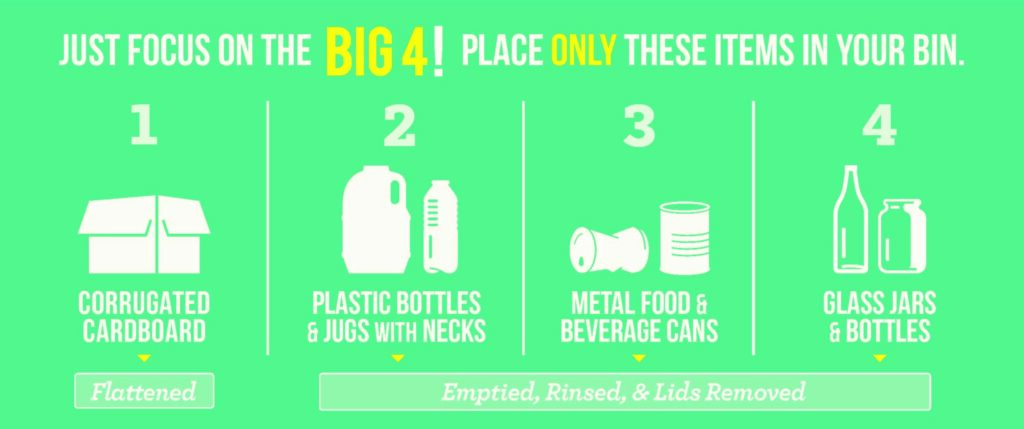 Recyclable materials will be picked up each week on the same day that trash is collected. Your are required in the Borough to recycle the following items known as the “Big 4” :